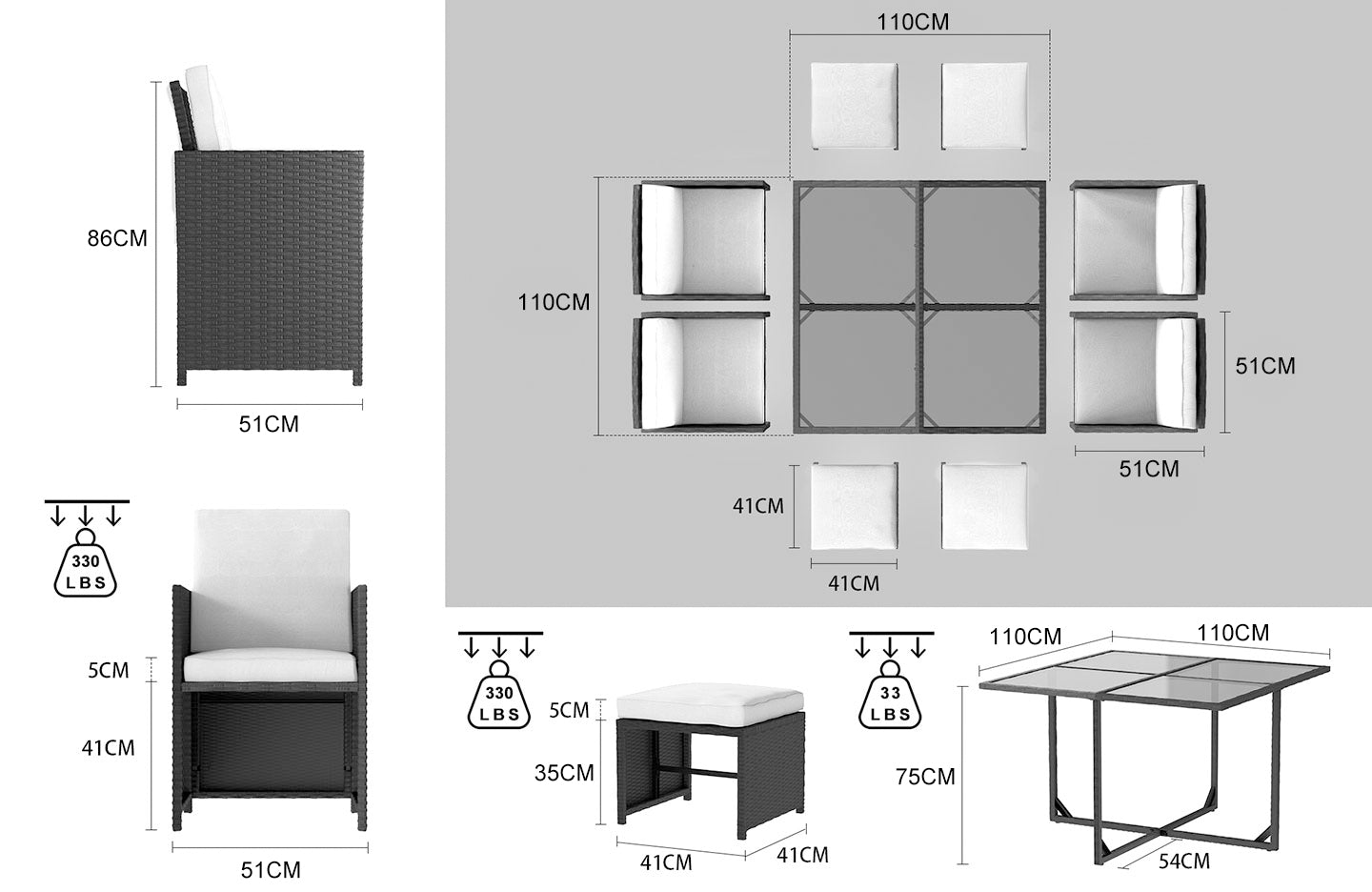 - Dining Table: 110 x 110 x 75 cm (Weight Capacity: 33LBS)