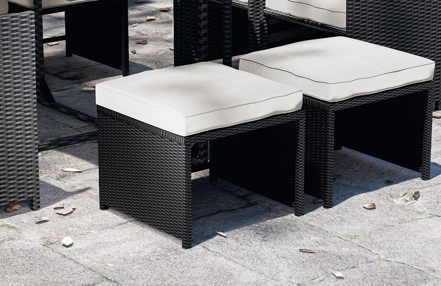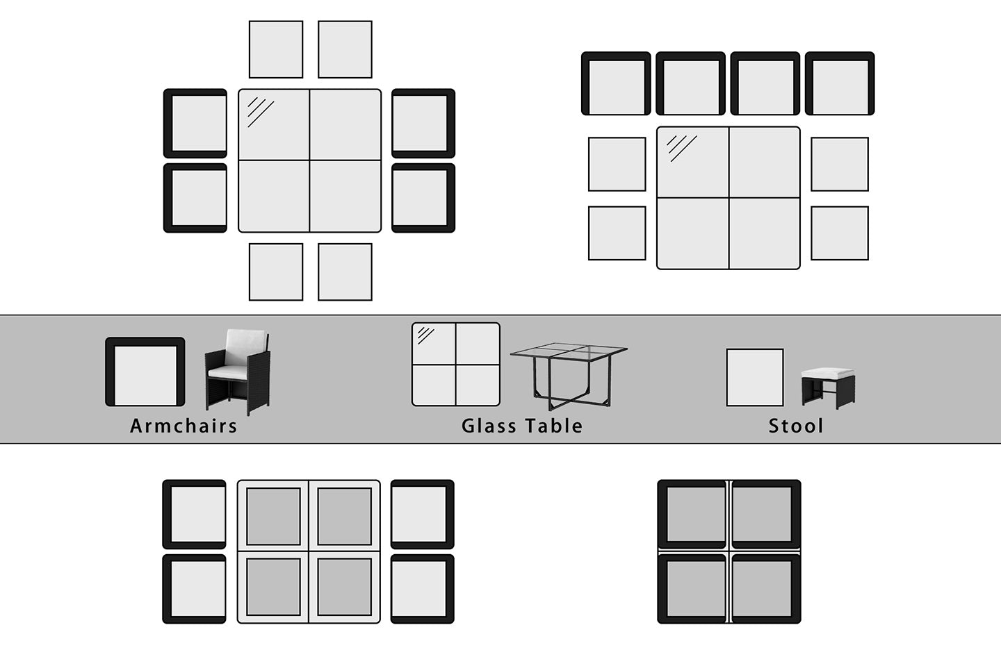 - Package Includes: 1x Table, 4x Chairs, 4x Footstools, 4x Tempered Glass, 8x Seat Cushions, 4x Back Cushions