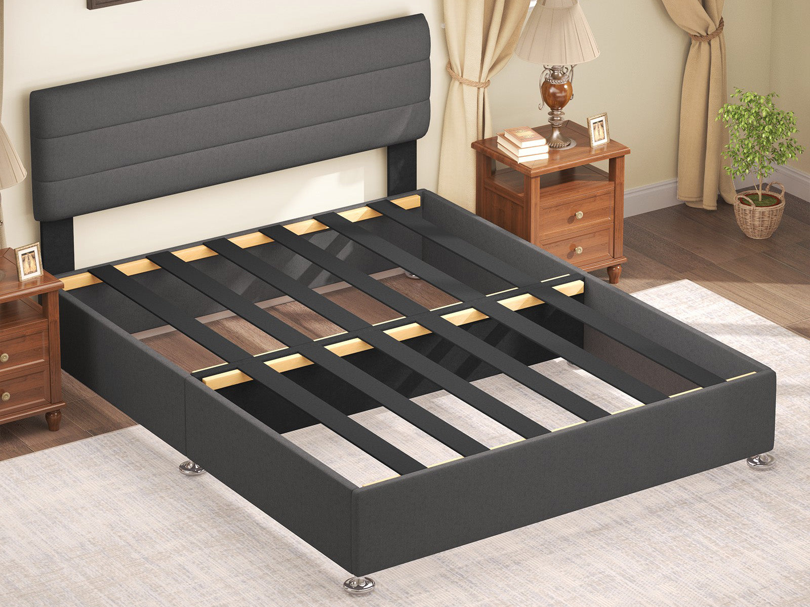 Constructed with durable wood slats, this bed base is upholstered in elegant linen fabric and paired with a matching headboard, giving a modern, stylish look to your bedroom. Solidly built, it provides reliable support and a firm foundation for your mattress, with chrome glider feet adding an aesthetic finishing touch.
