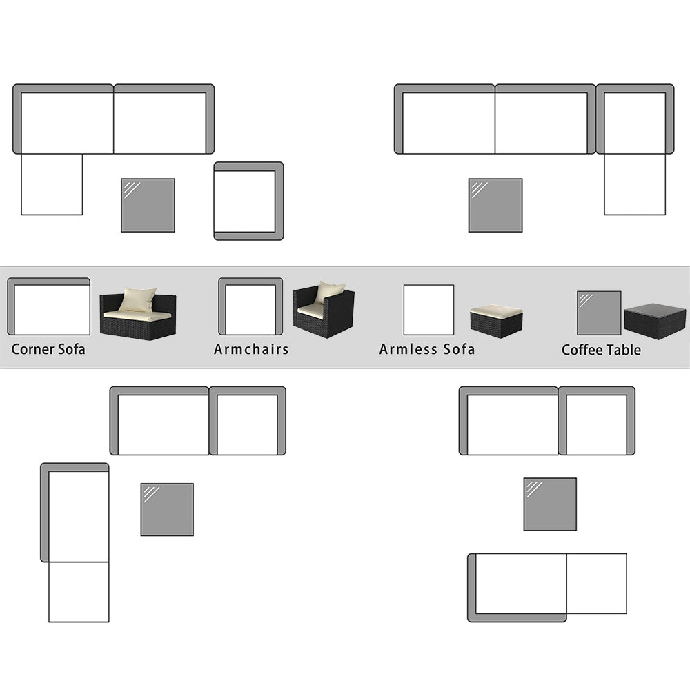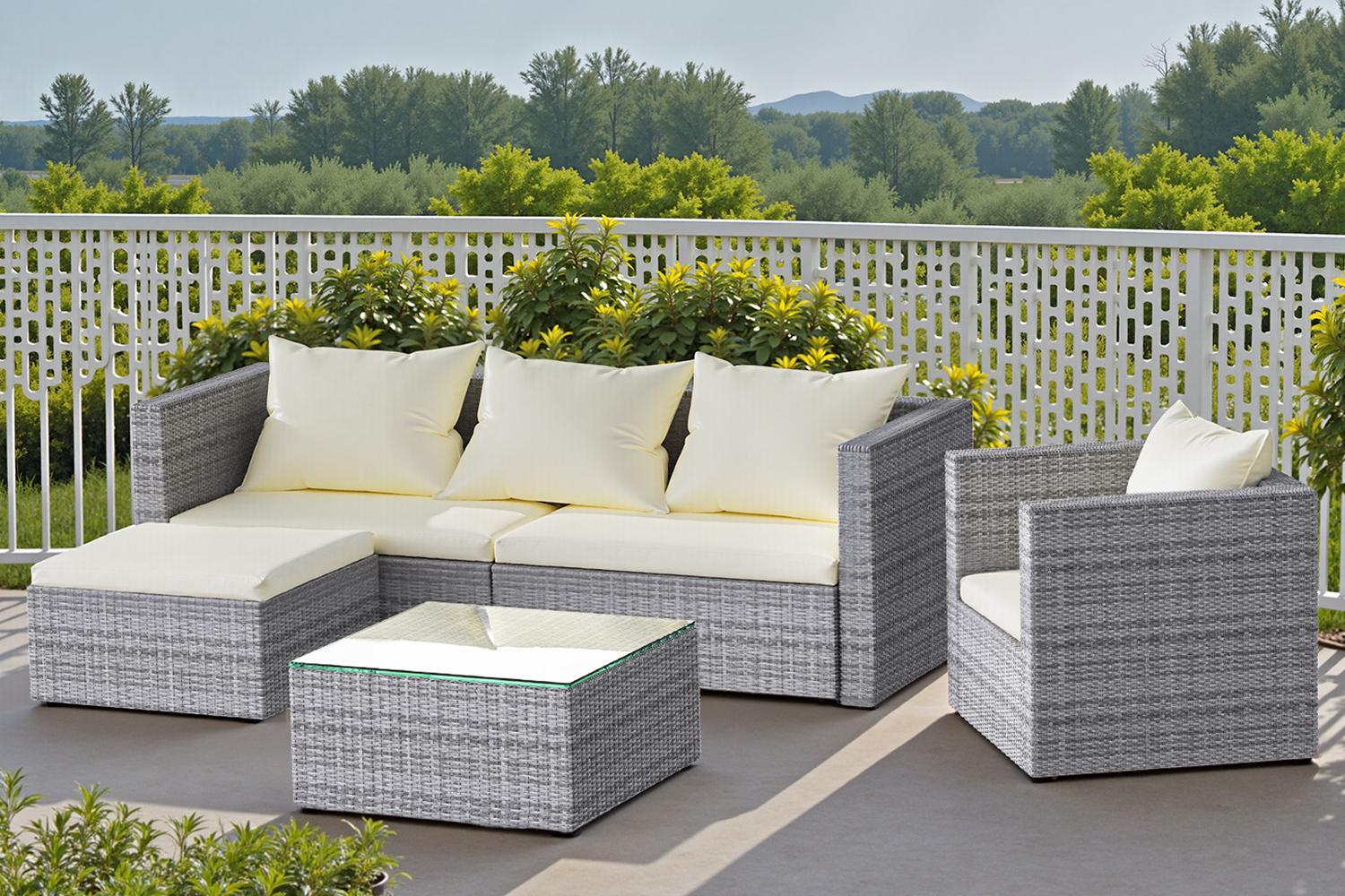 The five-piece set comes with a 3-seat modular corner sofa, armchair, footstool and a glass topped coffee table, which can be arranged in different styles as needed. It offers ample amounts of space for you and your guests to lounge back, ideal for outdoor relaxation or entertaining.