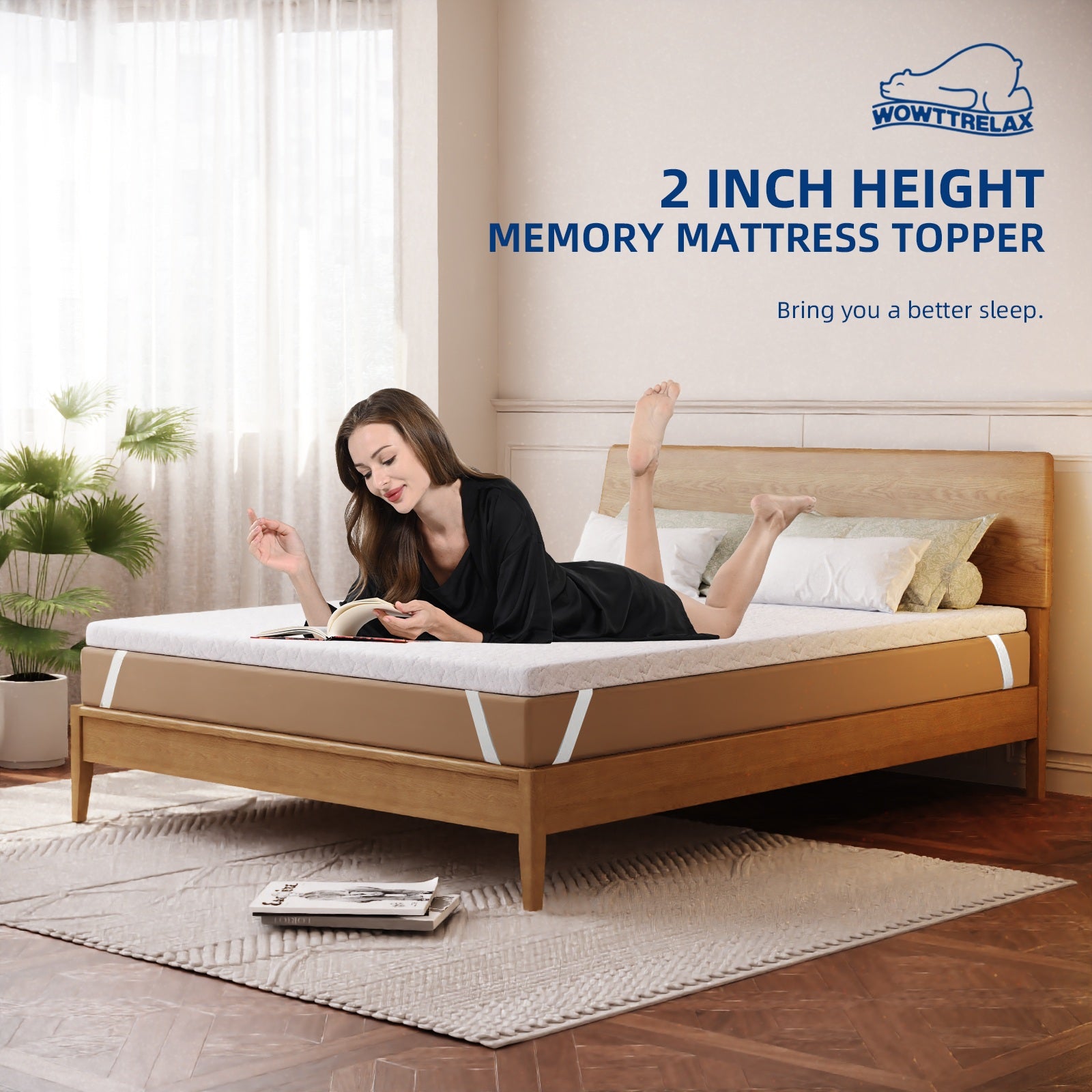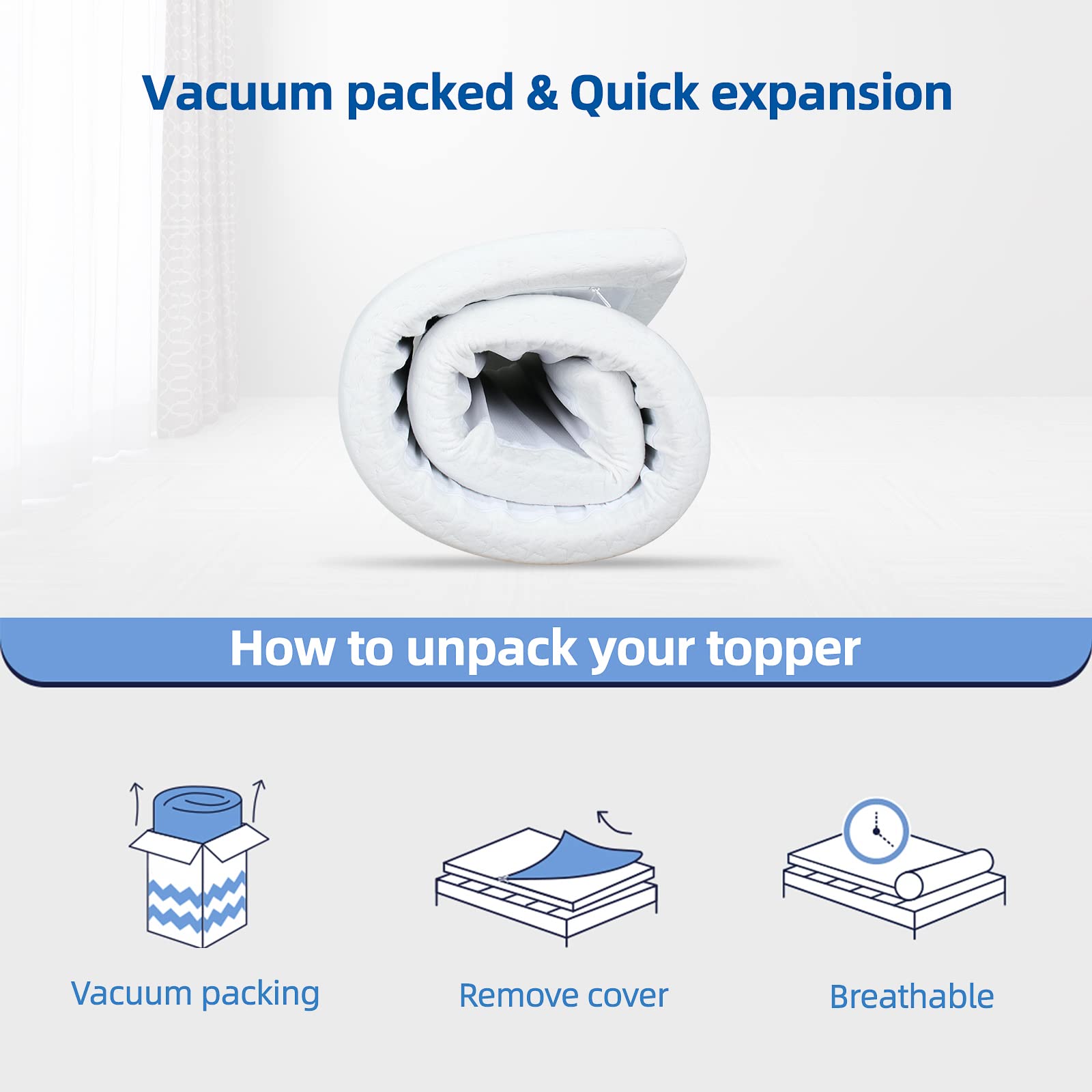 Our Mattress Topper features double-layer design, with a combination of 2cm gel memory foam and 3cm high density foam, which not only has the effect of thermal regulation, allowing to adjust the temperature of the human body during sleep to create a comfortable sleep for the body all night, but also is characterized by slow rebound, helping to release pressure and adapt to the human body.