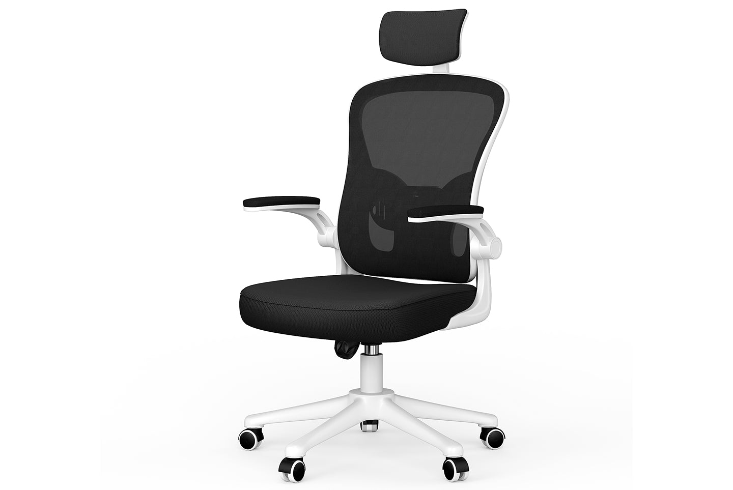 Lower the armrests as arm support while working to relieve fatigue. Off the seat, folds to 90 degrees, and slides under the desk for storage.
