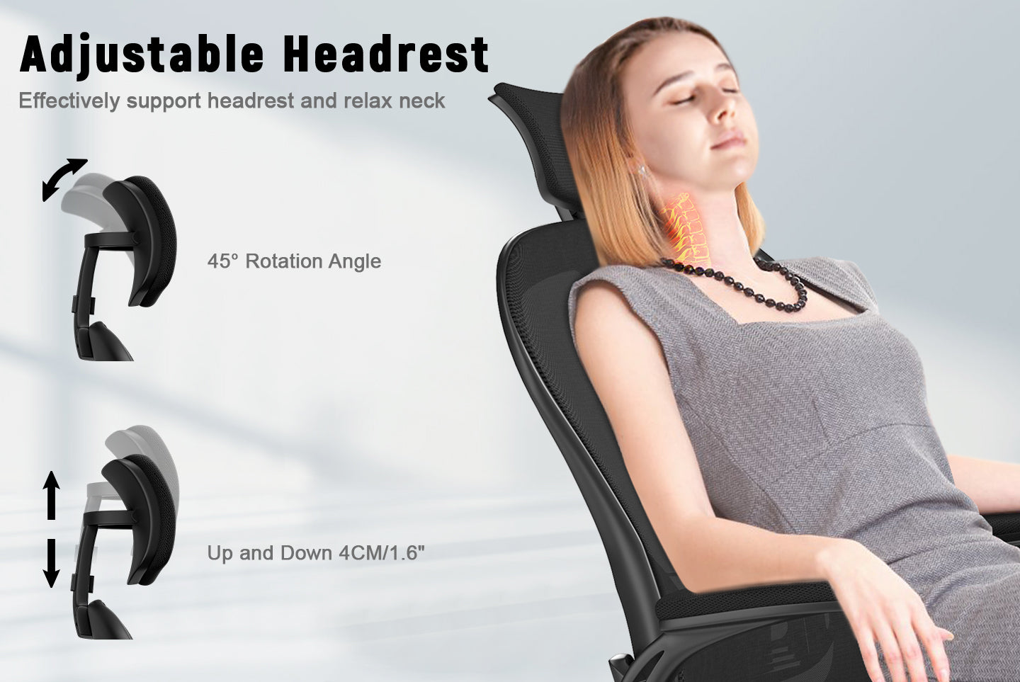 Move the headrest up and down to support your neck and head, reducing neck and shoulder soreness during sedentary work.